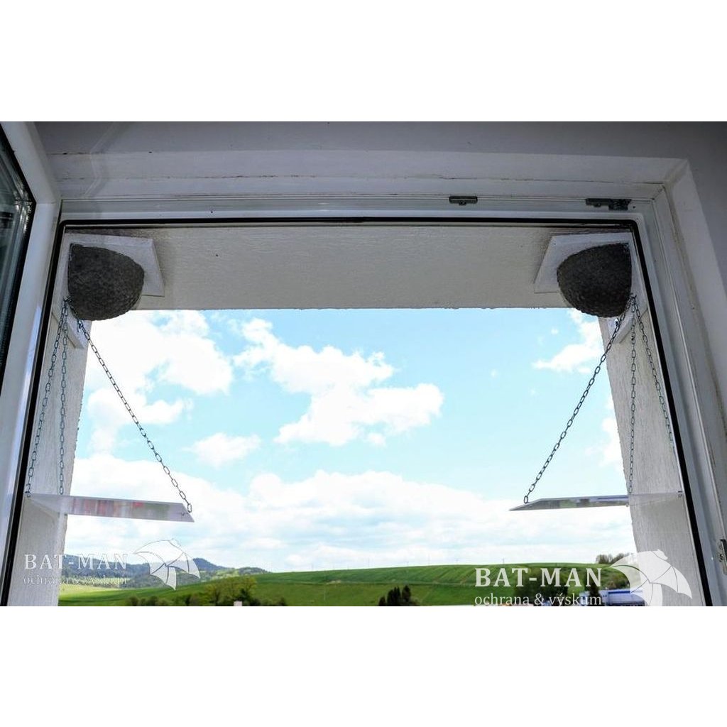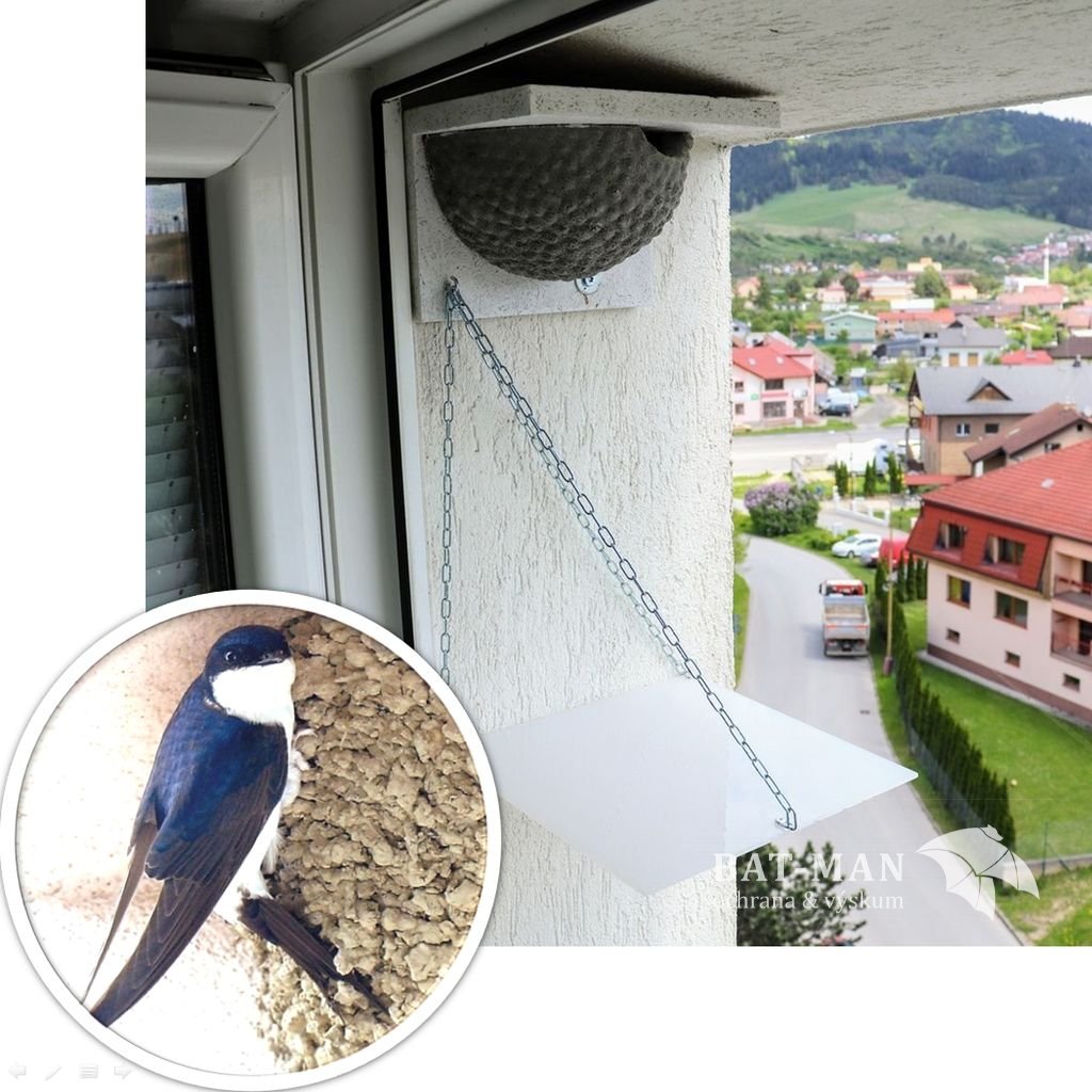 Designed by ornithologists for house martins, also known as barn swallows. An elegant solution for windows on apartment buildings and family homes. Due to plastic windows and silicone plasters, house martins lose a lot of traditional nests - the nests don't hold on such surfaces or fall with their young. This substitute nest provides a safe and durable alternative. It is narrowed to 21 cm, so it fits into narrower window frames. Natural nests are often attached to windows and fall off when windows are opened. With an artificial nest, opening the window is not a problem. The pad under the nest is made of white plexiglass and prevents the windowsill from getting dirty. The nest opening faces away from the window, so the window stays clean. The nest is made of durable wood-concrete and is resistant to predators (woodpeckers, falcons, magpies). House martins accept them, but they need time, and occupancy can take one or two nesting seasons.