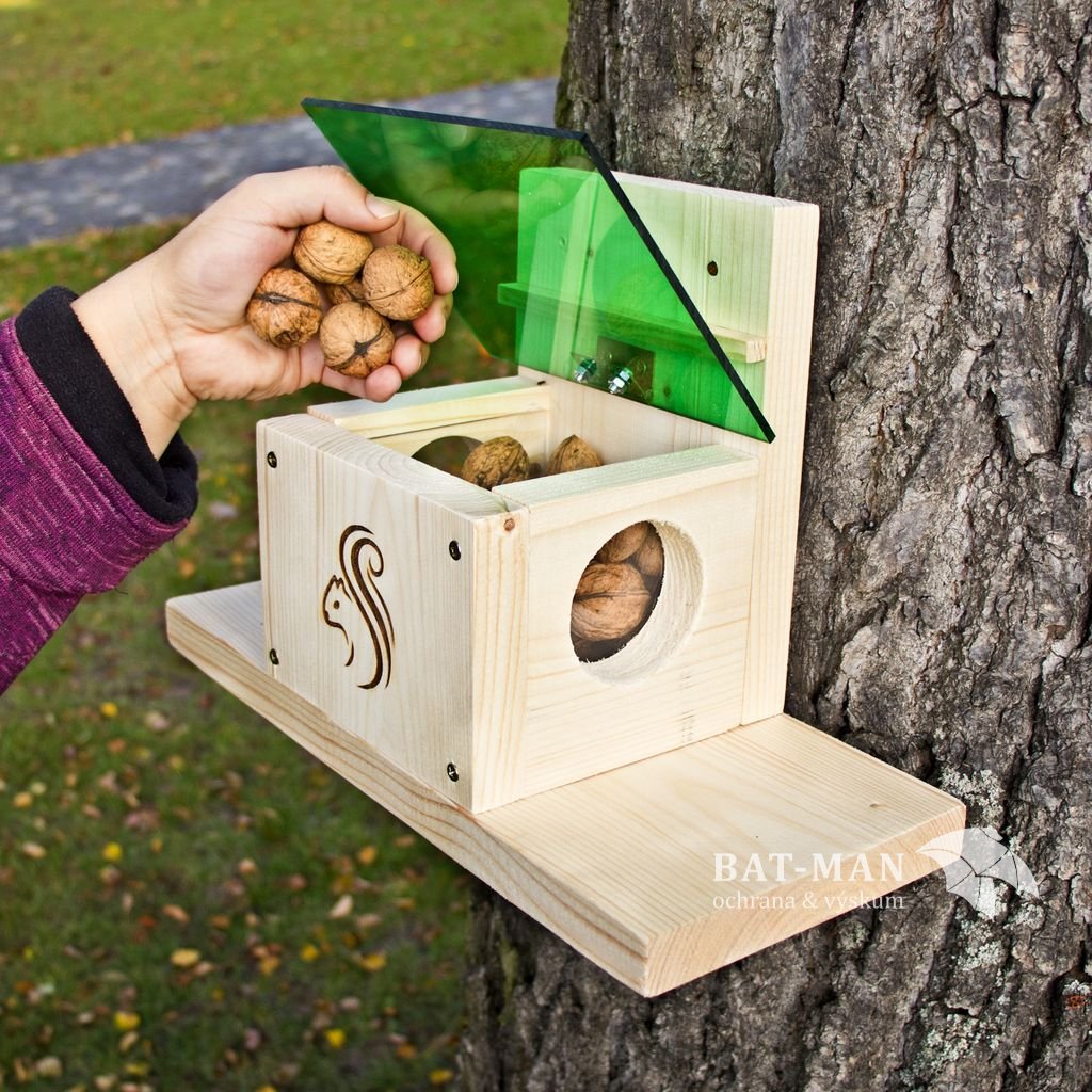 This feeder is designed to attract squirrels to your garden and offer them a feeding spot. The original design was created in Slovakia and provides easy access to food for the squirrels directly from the tree trunk onto one of the two platforms. The openings on the sides attract their attention as they resemble the size of their favorite tree hollows, but they are covered with transparent plexiglass, and the squirrel needs to figure out that the roof can be lifted. For this energetic and clever animal, it's not a problem. The roof protects the food from other greedy animals such as mice or birds.