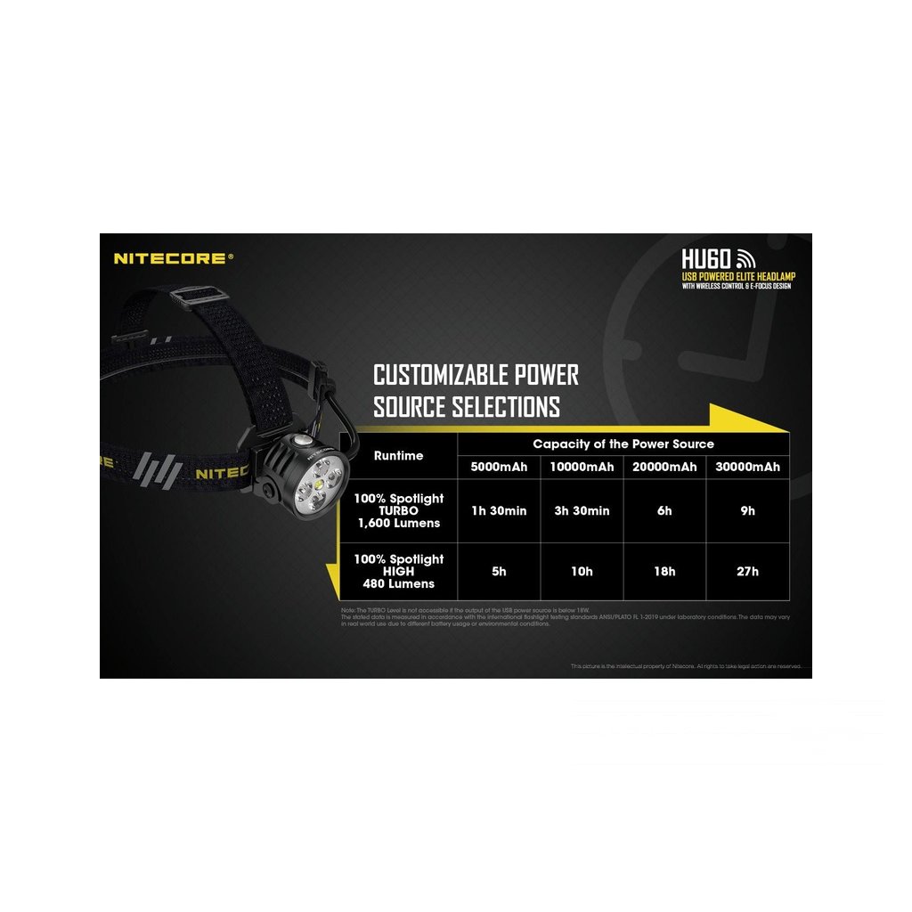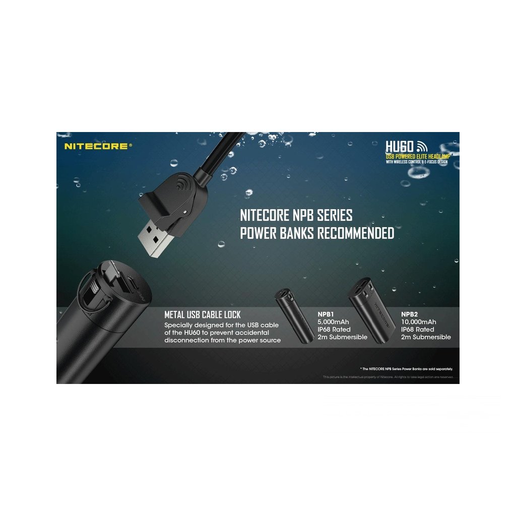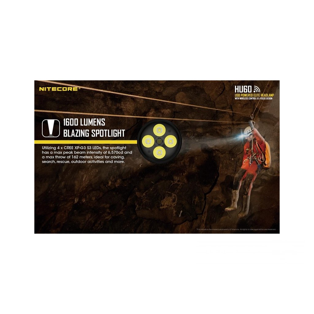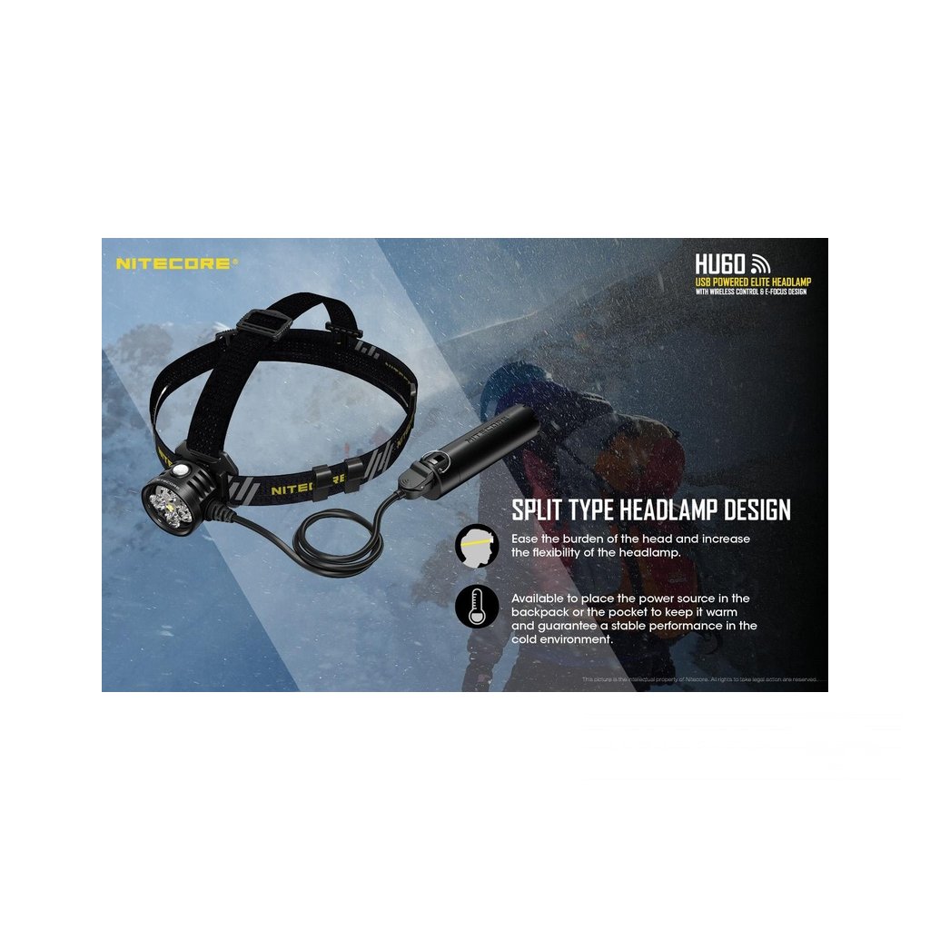 LED Headlamp NITECORE HU60, with an LED output of 1600 lumens, powered via USB from an external source, for greater wearing comfort and the possibility to connect an external power source with higher capacity.
